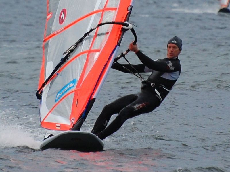 We zijn met een paar surfers gybe-jes gaan oefenen: Baai in knallen en dan in het vlakke water gyben.<br />Hans komt hier het baaitje binnen varen.