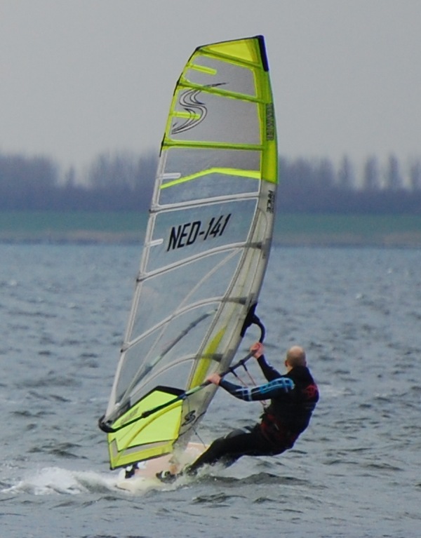 We zijn met een paar surfers gybe-jes gaan oefenen: Baai in knallen en dan in het vlakke water gyben.<br />Hier varen ik en Arno naar buiten. O ja, Kees staat er links ook nog op.